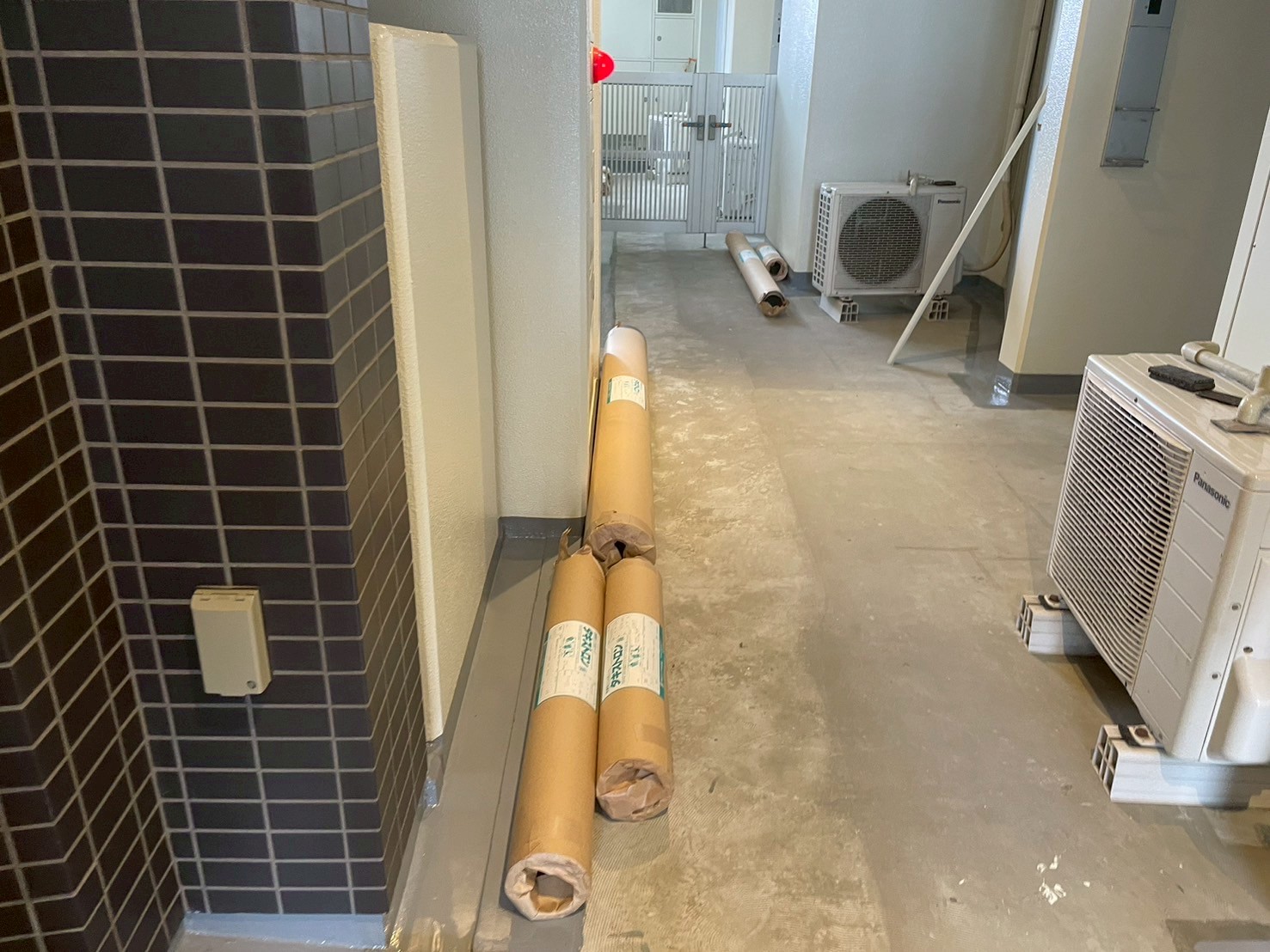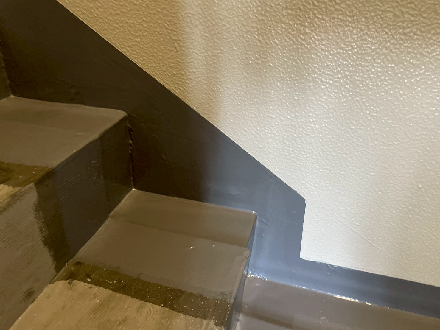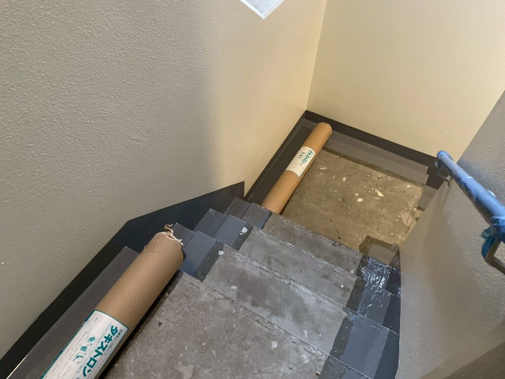 階段のライン出し・仕上げ塗装と、集会室屋根とゴミ置き場屋根の1層目ウレタン防水塗布をおこないました。