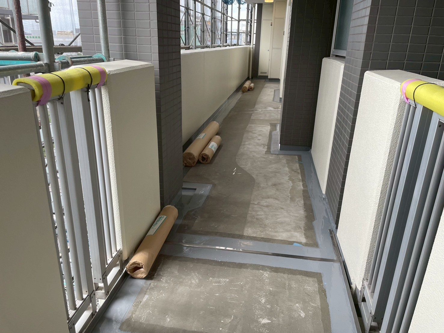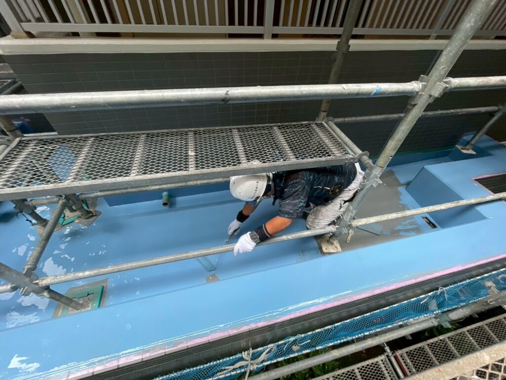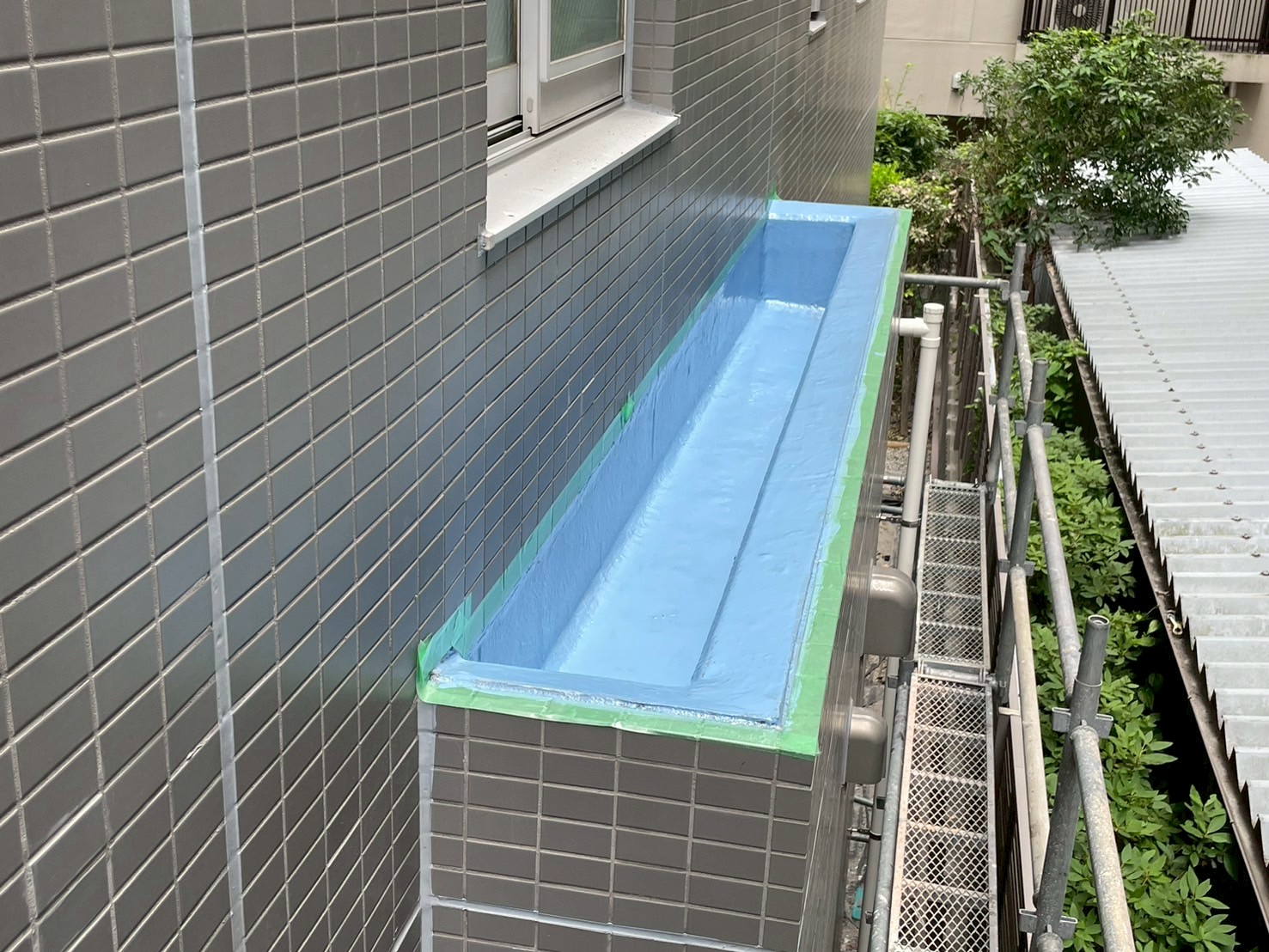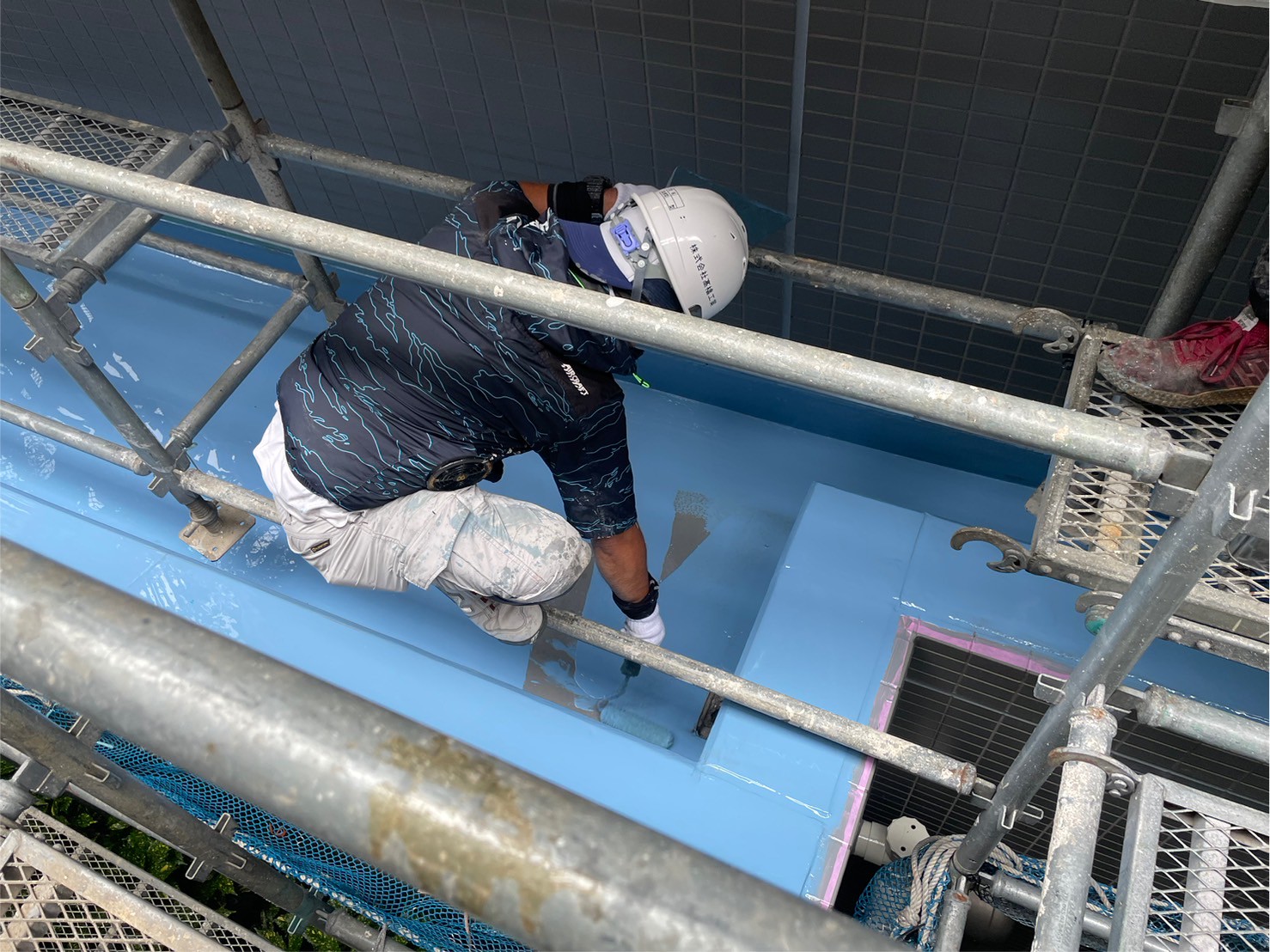 次回の防水工事は足場解体後に引き続き1階周りの屋根の2層目ウレタン防水とトップコート塗布をおこないます。