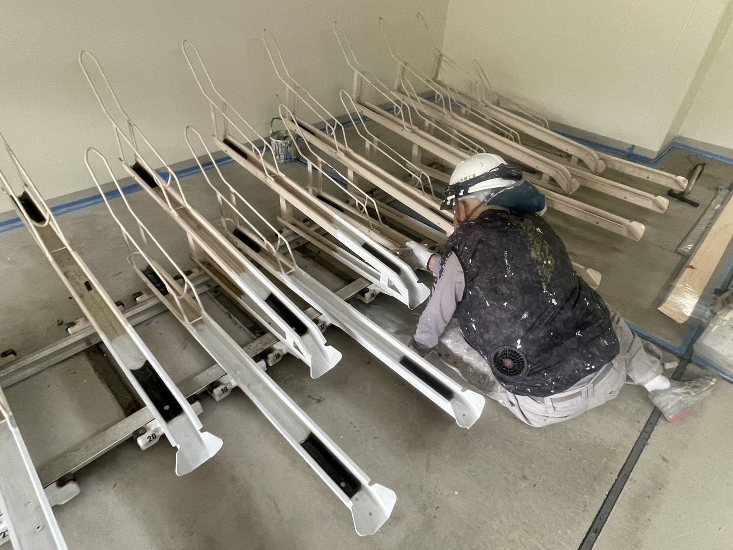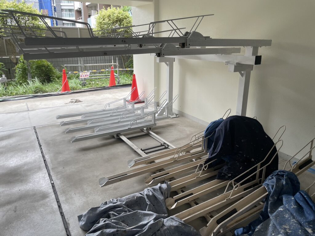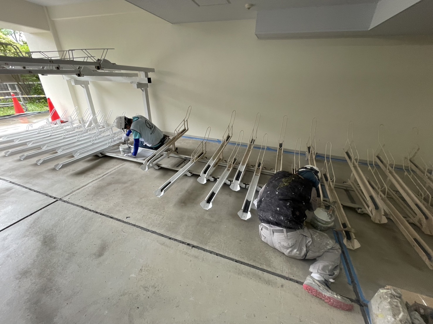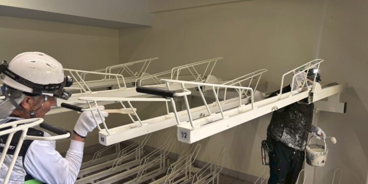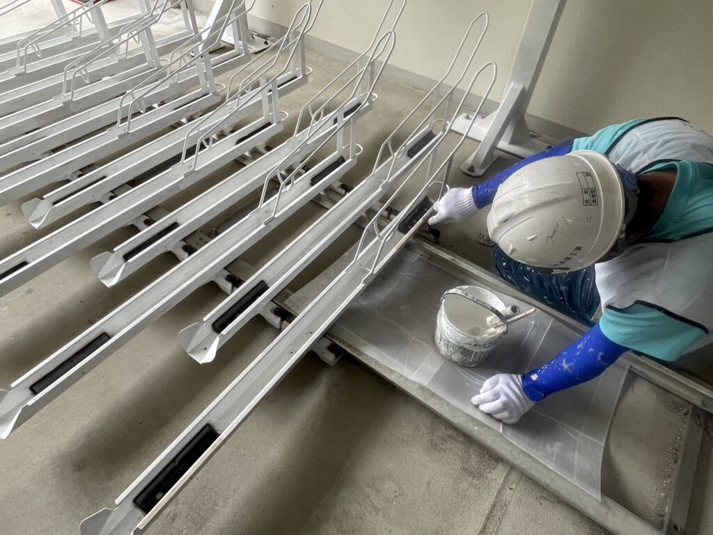 1番から35番の駐輪ラックの塗装工事を始めました。