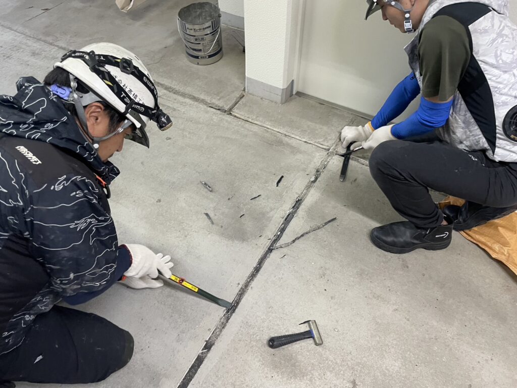 階段、廊下の長尺シートを張り終わりましたら、端末シーリングをおこない完了になります。