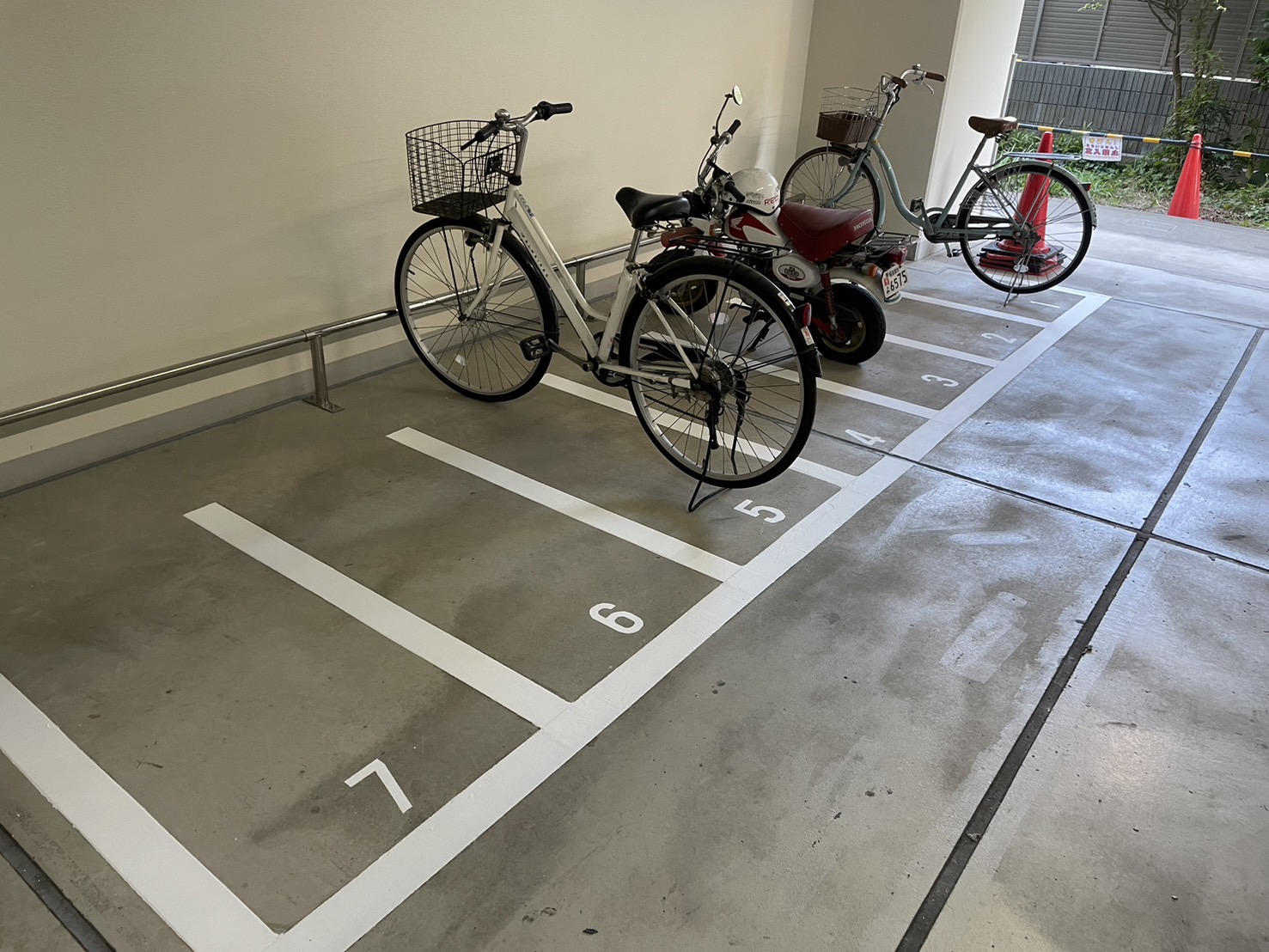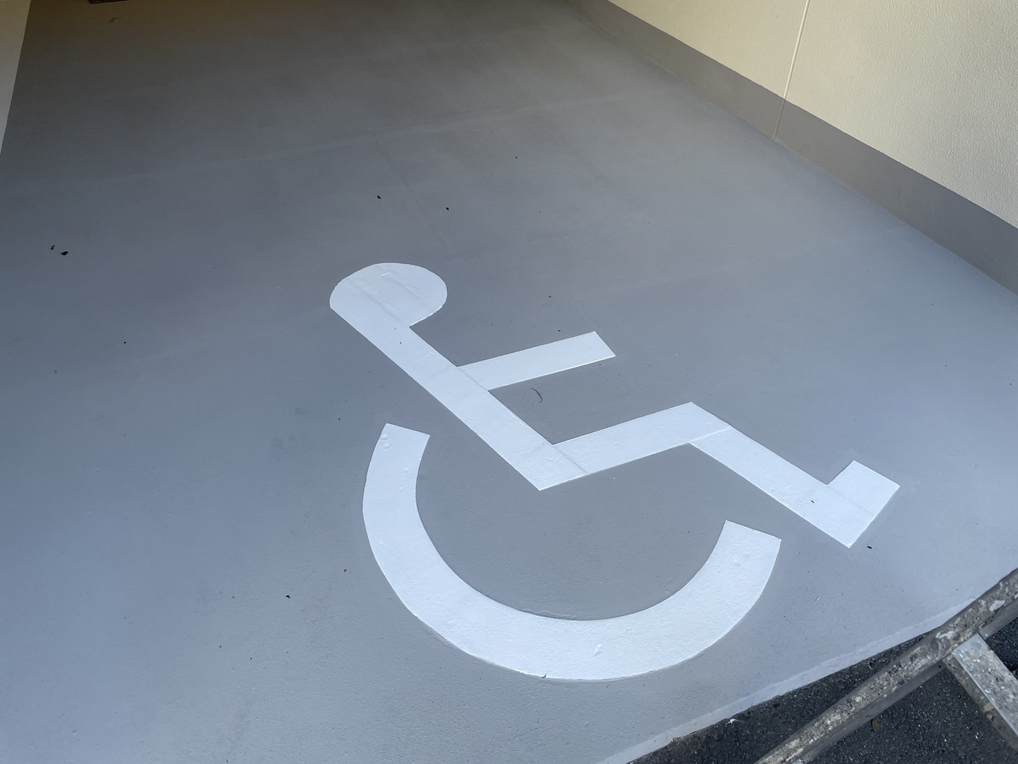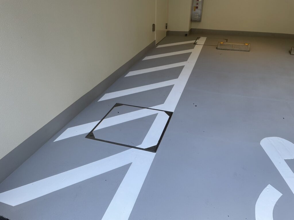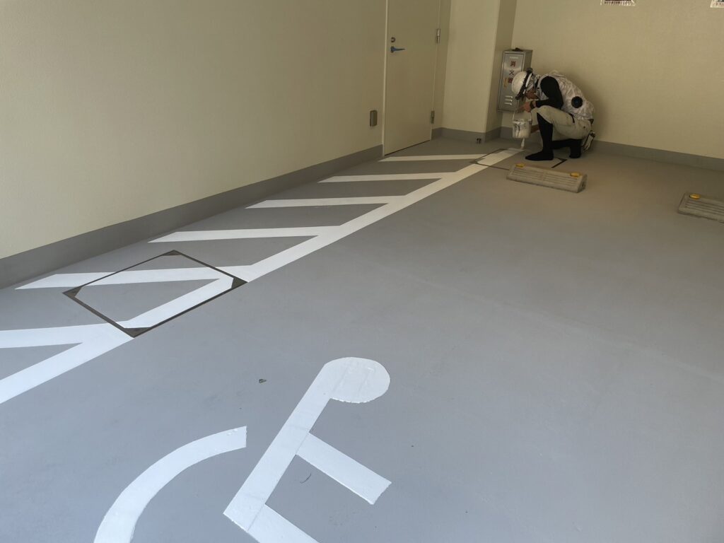 車いす用駐車場の床塗装と白色ライン引き、駐輪場のライン引きが完了いたしました。