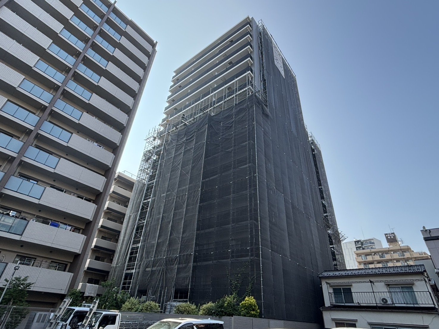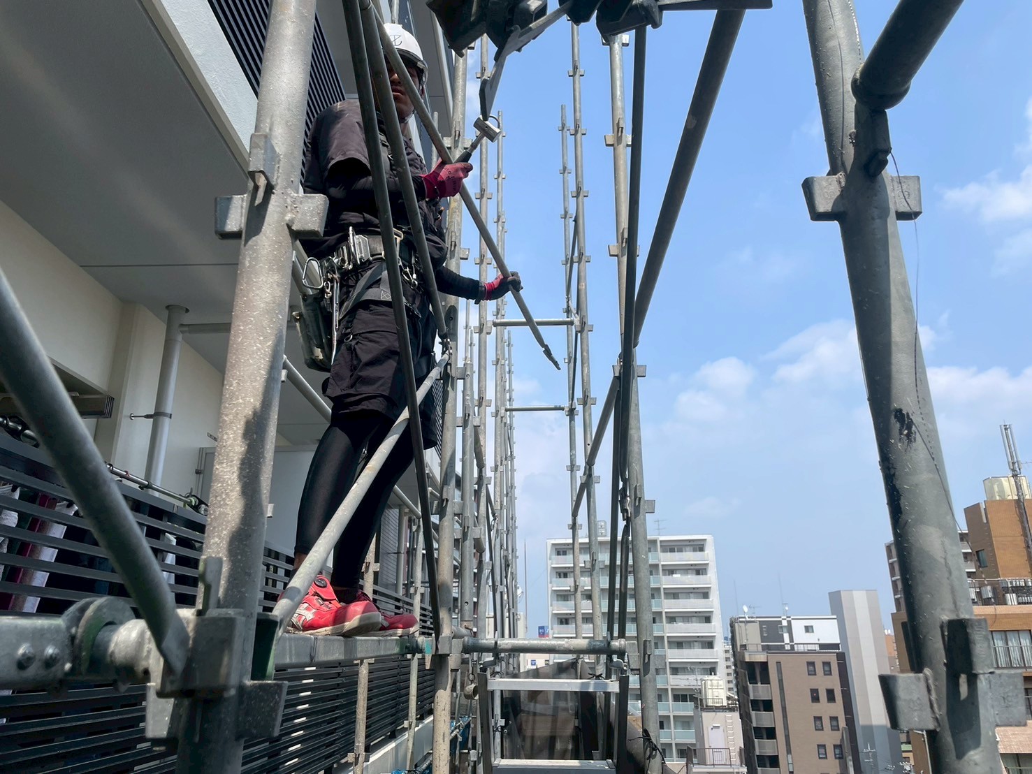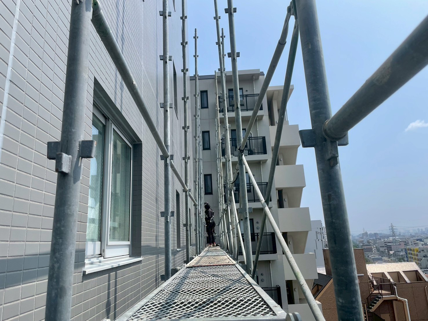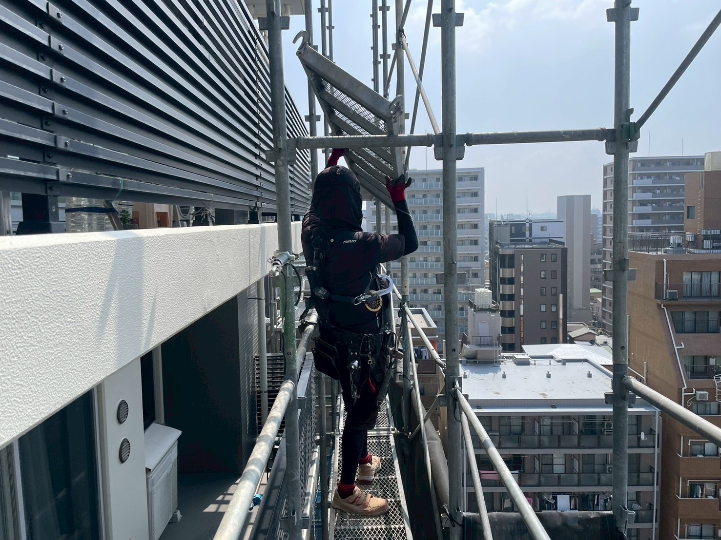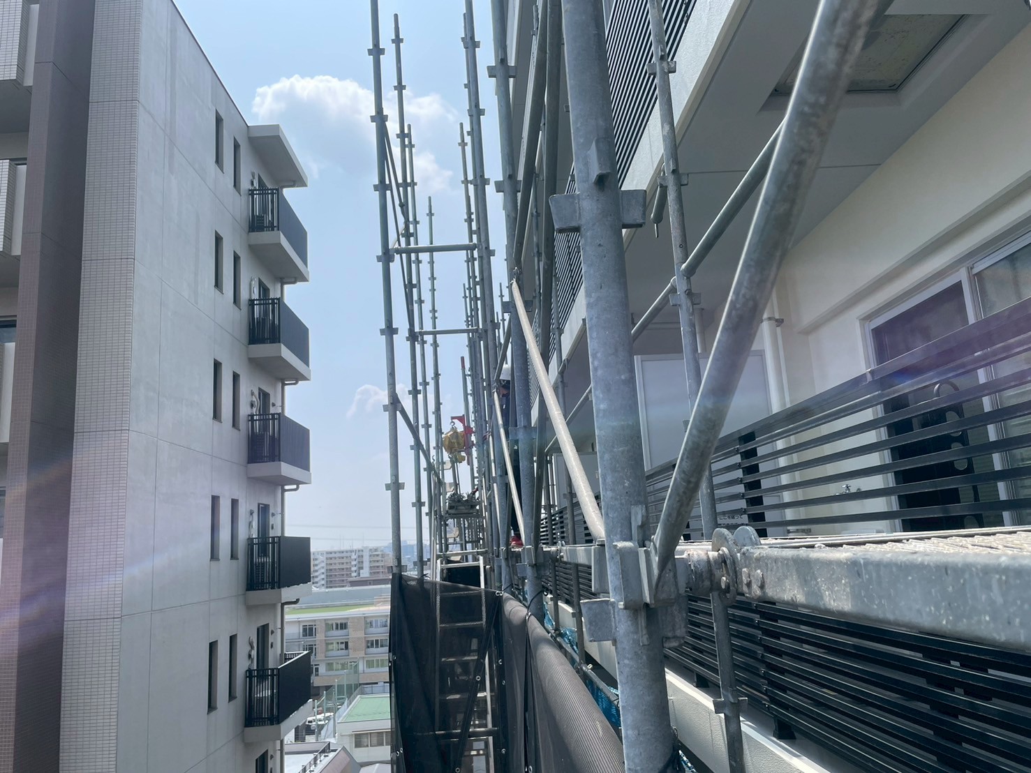 A棟バルコニー面・西面の11階から9階まで足場解体が完了いたしました。