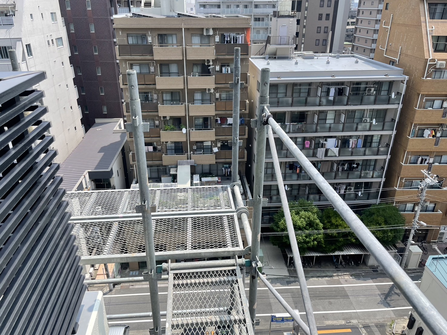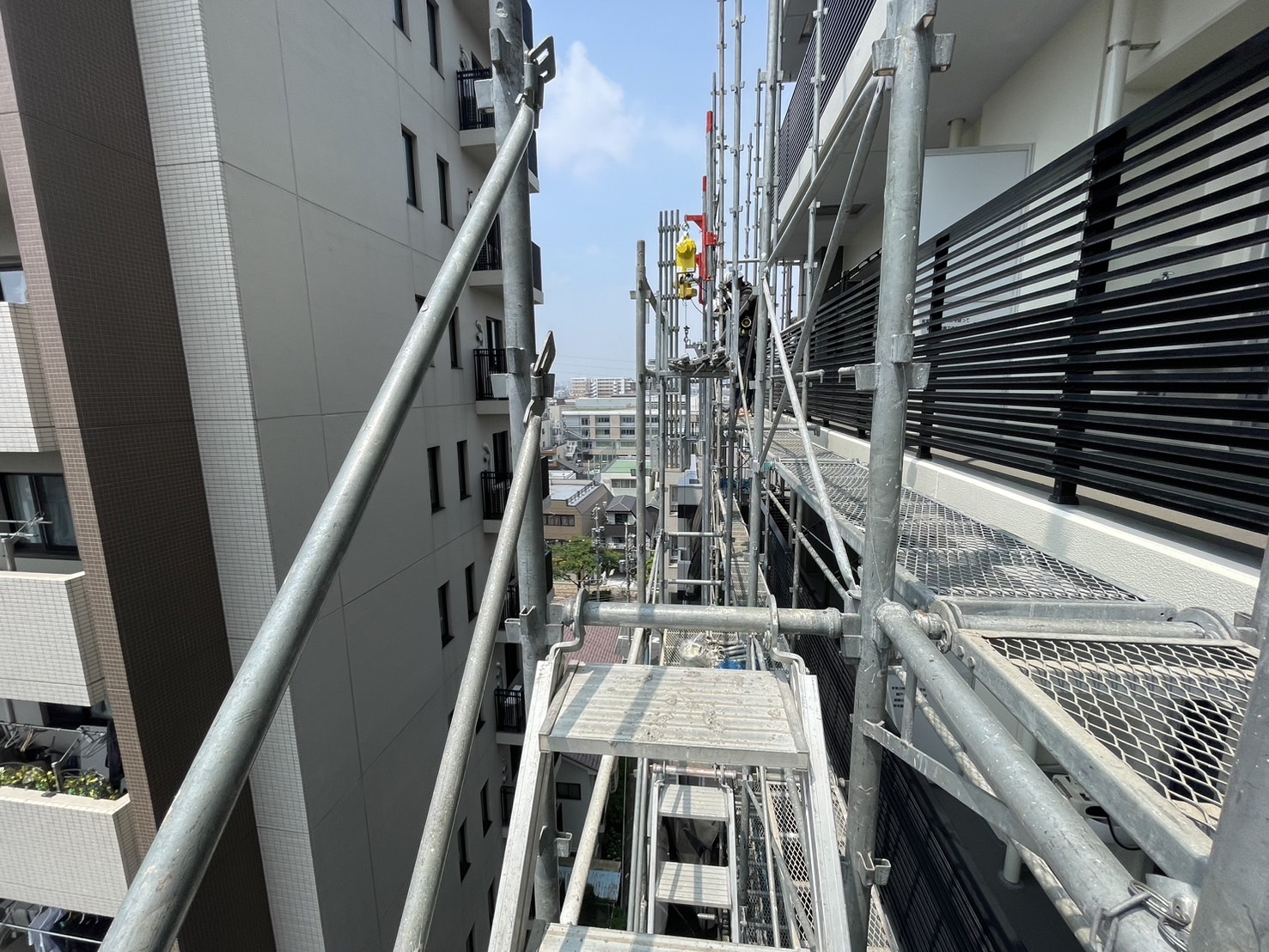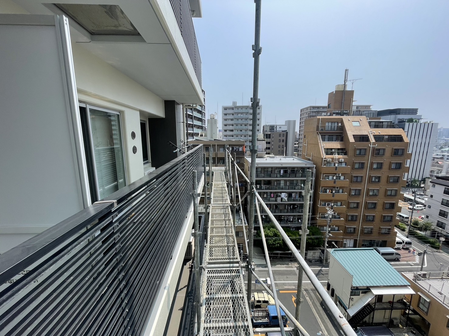 A棟南面(バルコニー)・西面の足場解体工事は7階まで解体が終わりました。