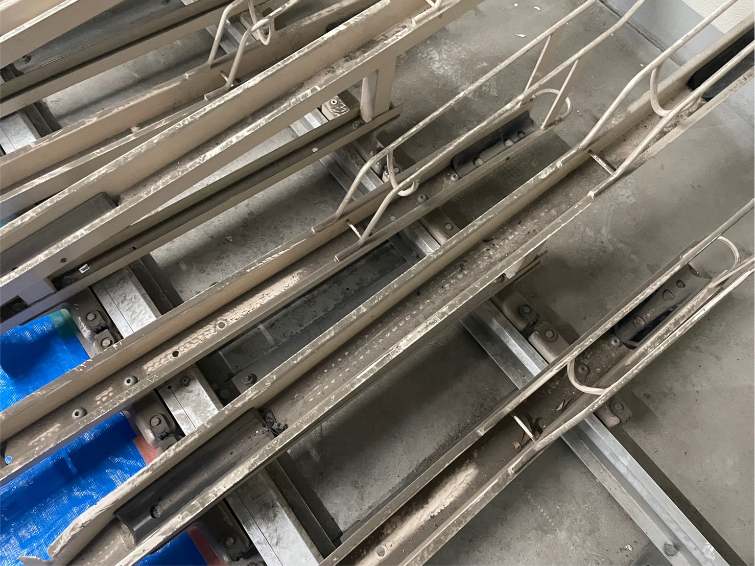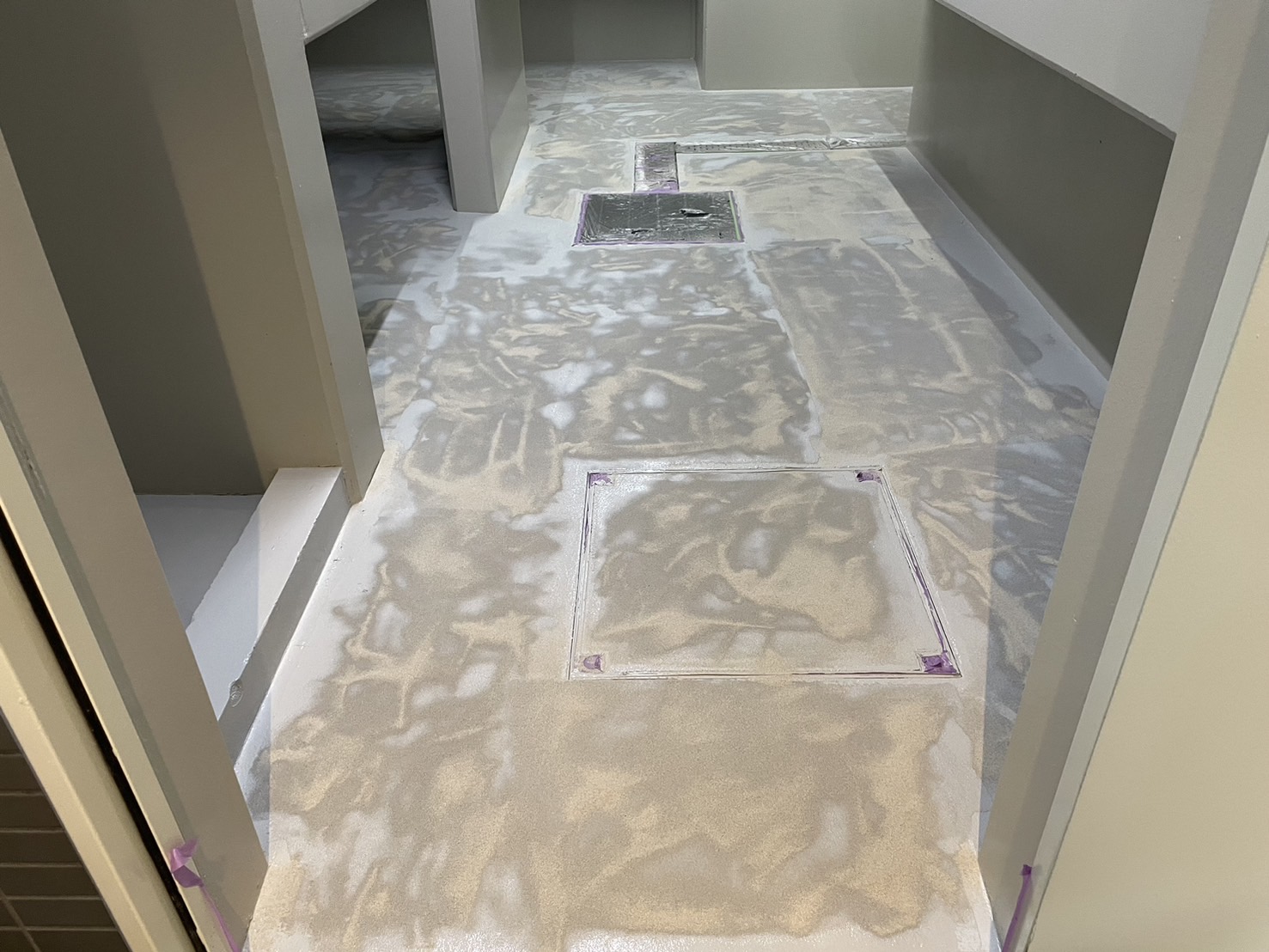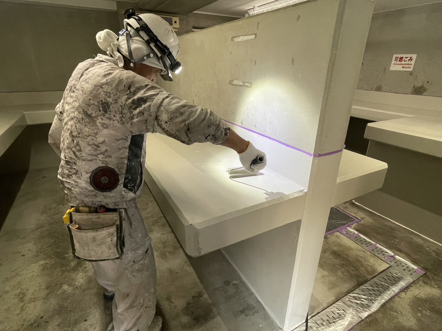 ゴミ置き場内の塗装工事、棚の塗装が完了し床の中塗り塗装の砂(珪砂)を巻きをおこないました。